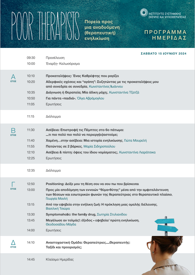* Η Ημερίδα απευθύνεται αποκλειστικά στους/στις εκπαιδευόμενους/ες & απόφοιτους του Ινστιτούτου Συστημικής Σκέψης & Ψυχοθεραπείας